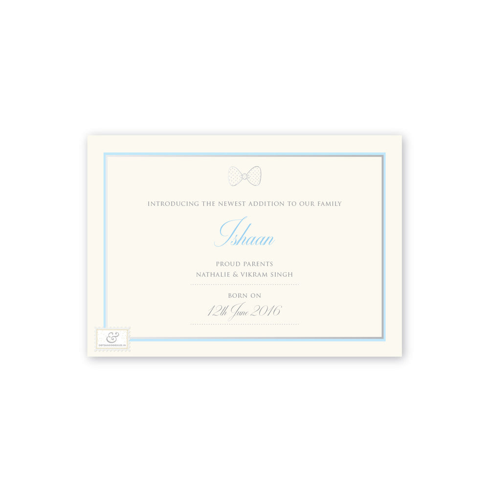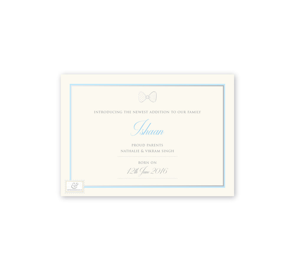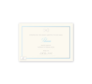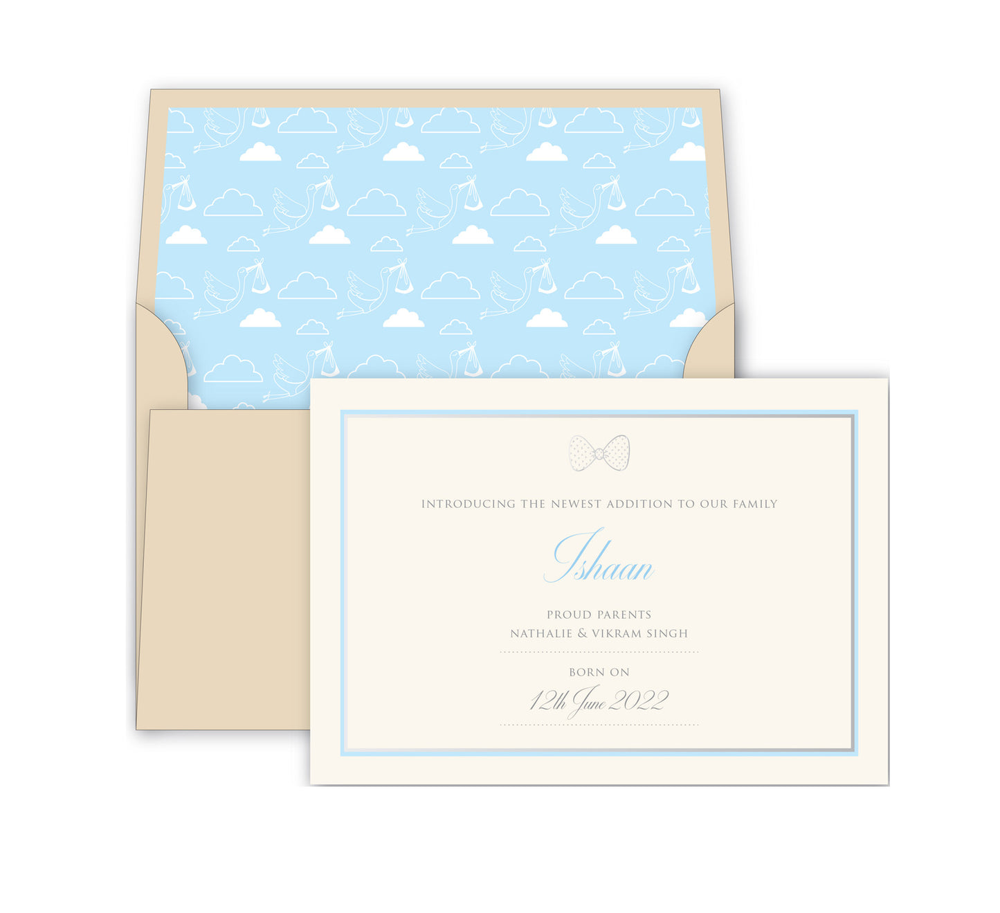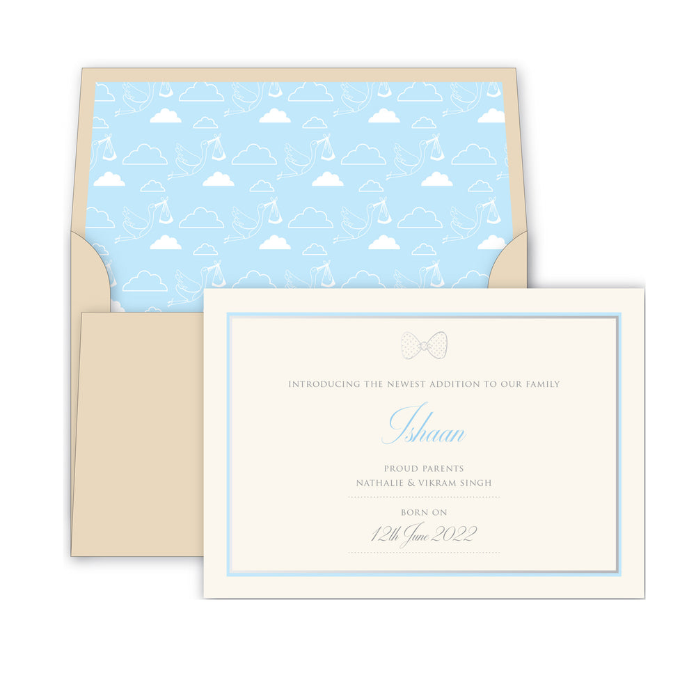 Announce the arrival of your baby with our Powder Blue Baby Announcement. Illustrated with a little mans bow tie, blue sky with a stork and baby. Paired with a off- white envelope. Spread the joy with an e-card, or make it even more special with the print card.