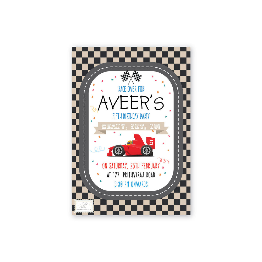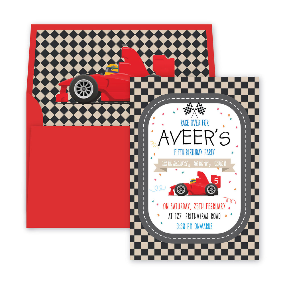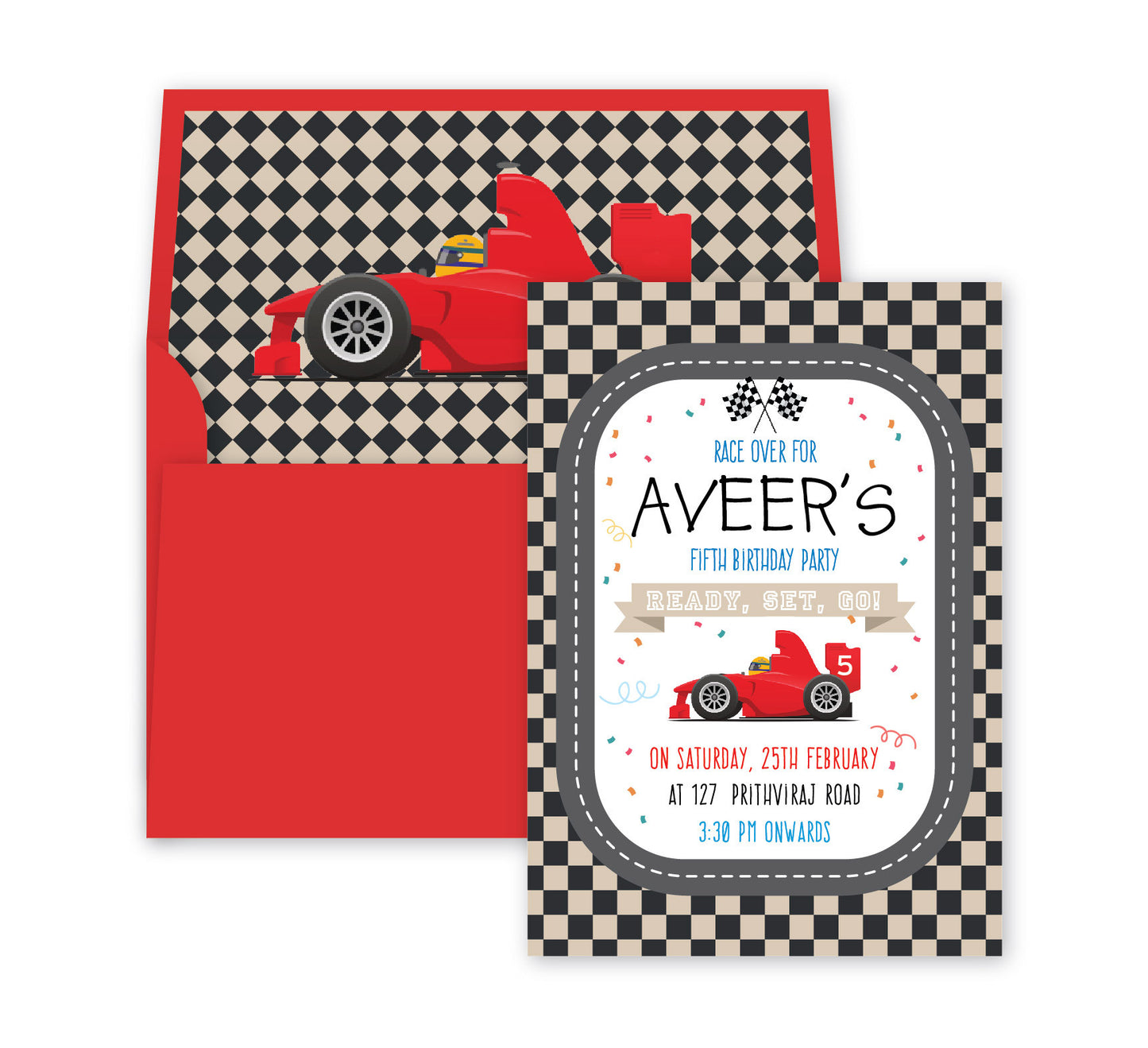 Kick off your Racecar Party in style with this customised birthday party invitation. Use the digital cards to send E-invites from your mobile or get your own set of beautiful printed invitations.