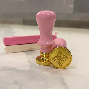 This stamp has an engraved royal motif and comes with pink and white gold wax sticks.