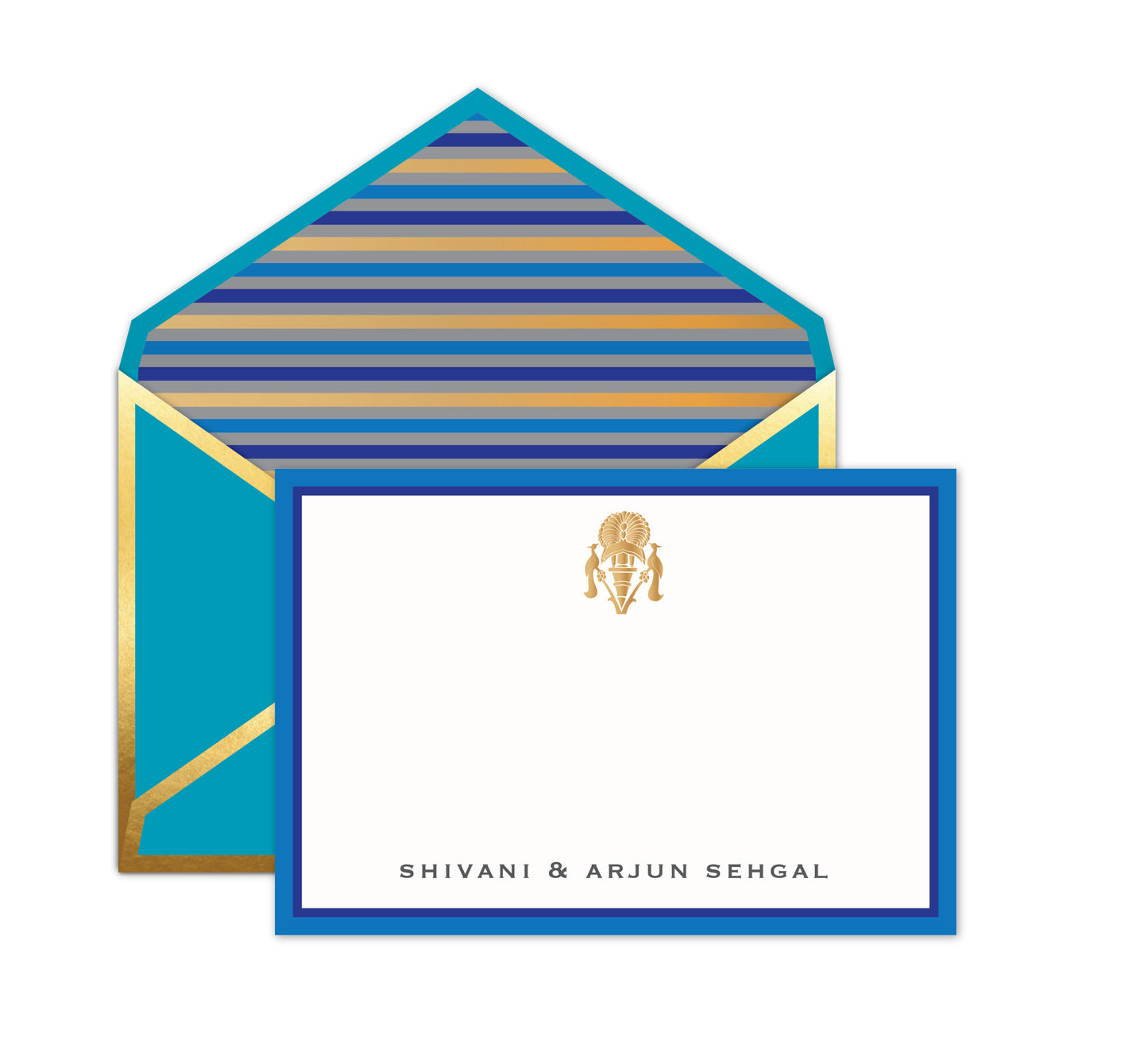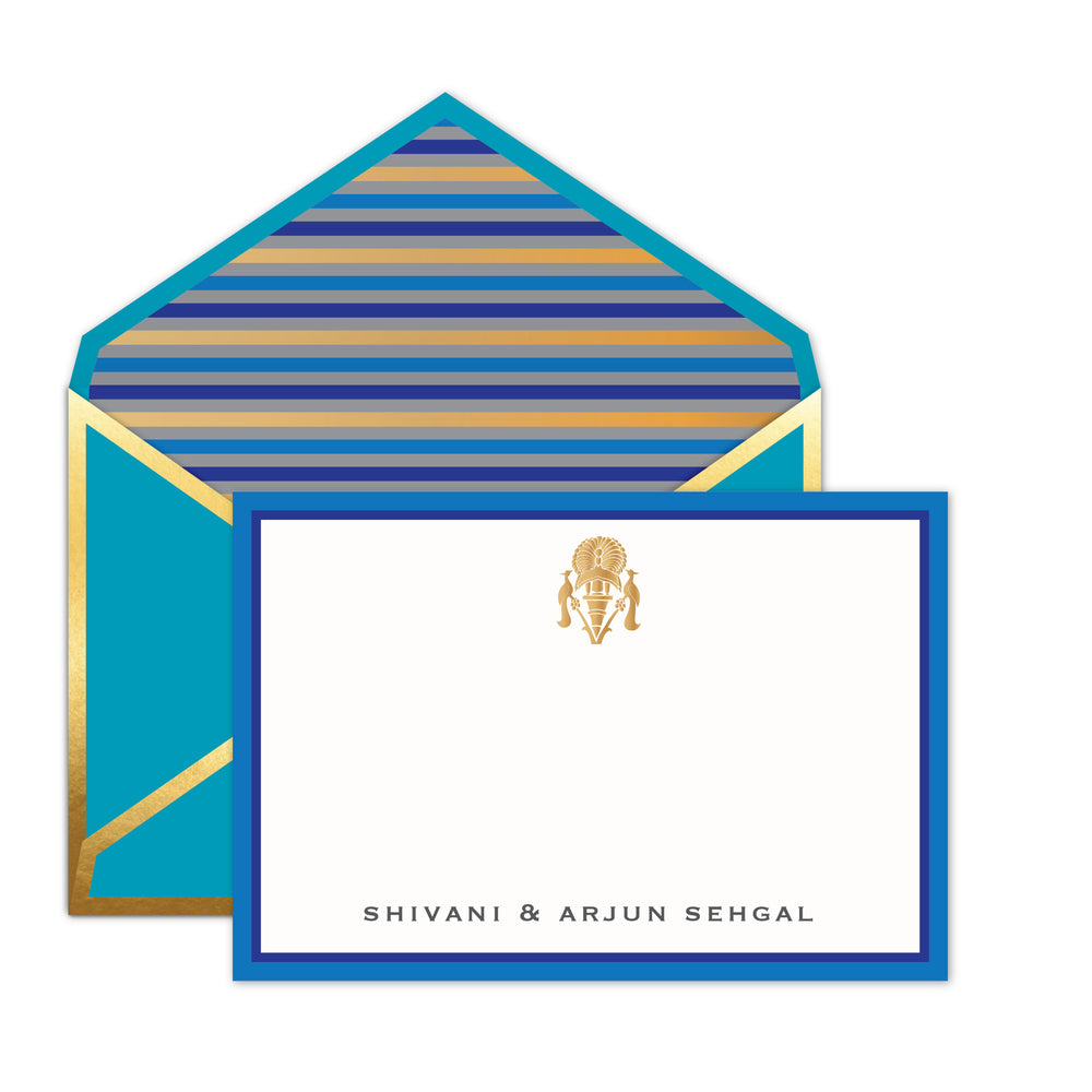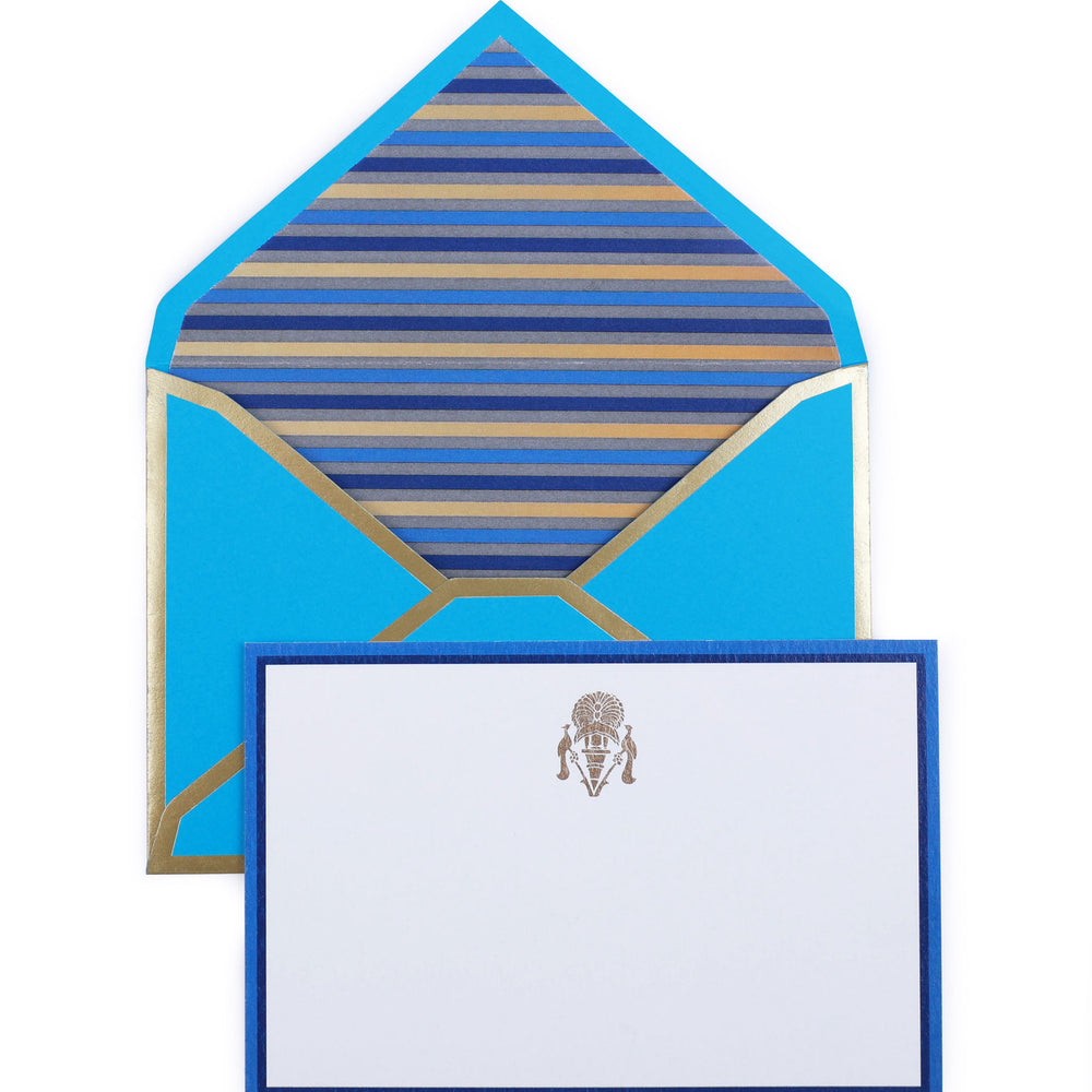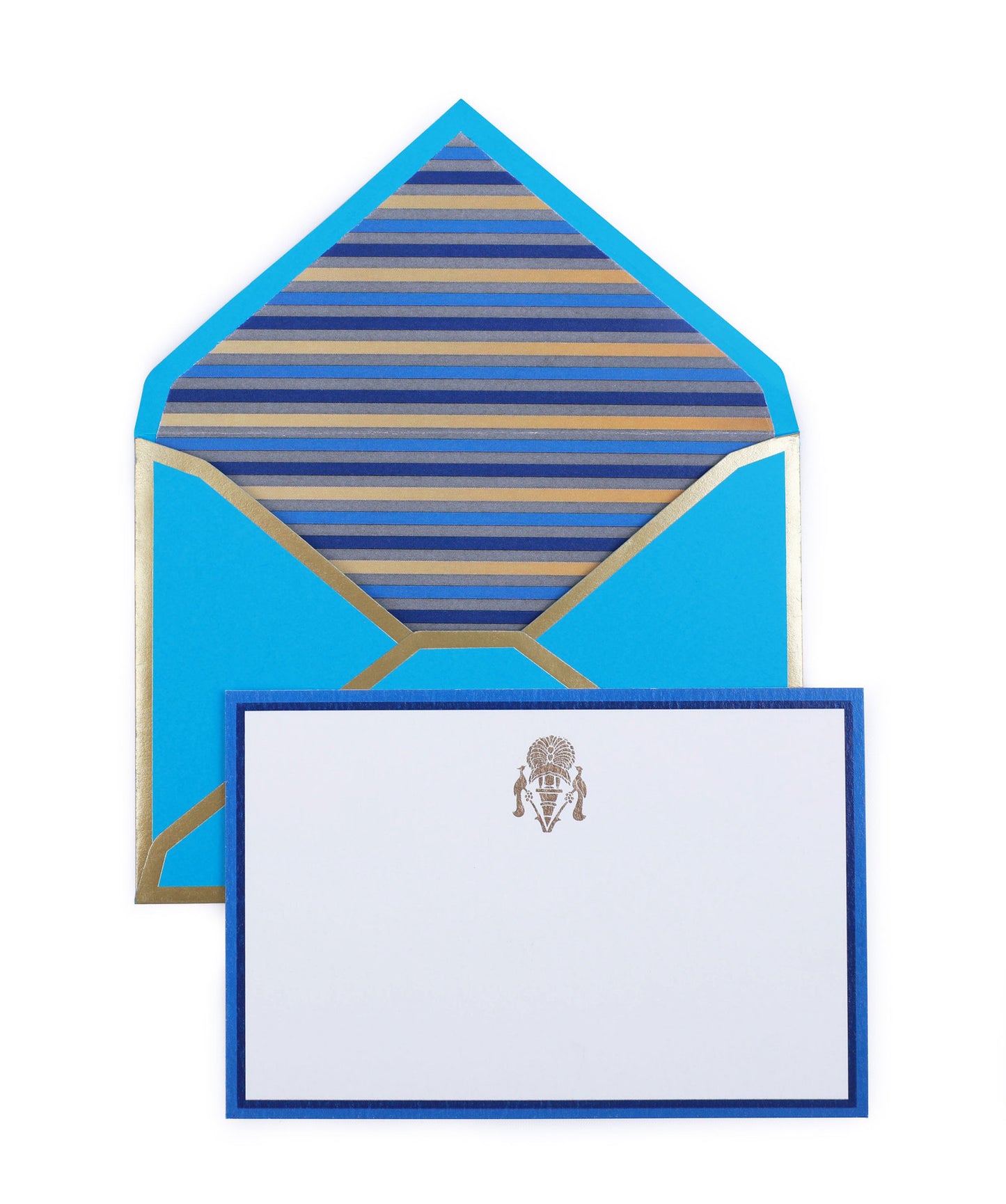 Beautiful set of notecards with sophisticated and elegant designs. This design features a royal motif on a complimentary white and blue palette. The envelopes are detailed with gold foil.