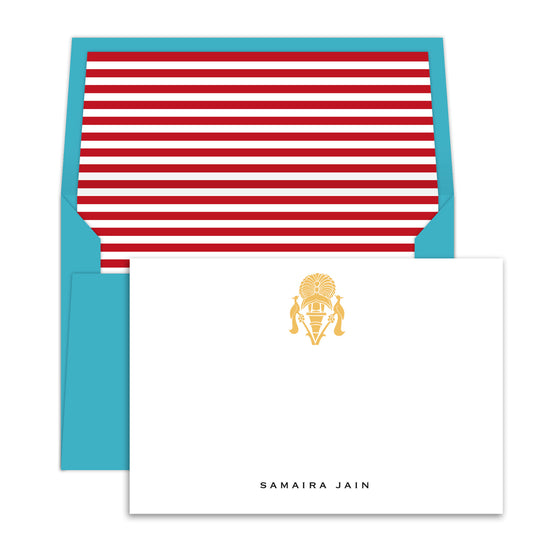 Royal peacock motif in gold with a modern red and white striped lining. Blue envelope.