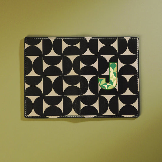 Meet your ultimate travel companion: a passport holder and luggage tag that blends bold style with personal flair. The striking black and green geometric backdrop, paired with a vibrant 'J', makes it not just a travel essential but a statement of identity and adventure.
