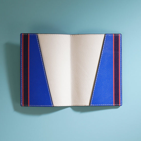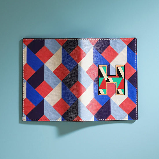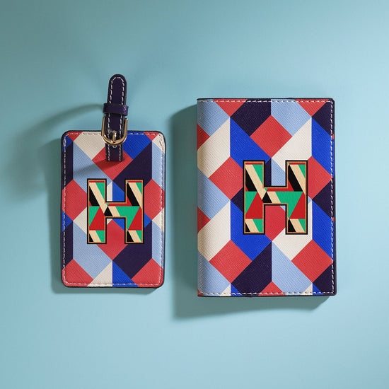 Meet your ultimate travel companion: a passport holder and luggage tag that blends bold style with personal flair. The striking blue and peach geometric backdrop, paired with a vibrant 'H', makes it not just a travel essential but a statement of identity and adventure.