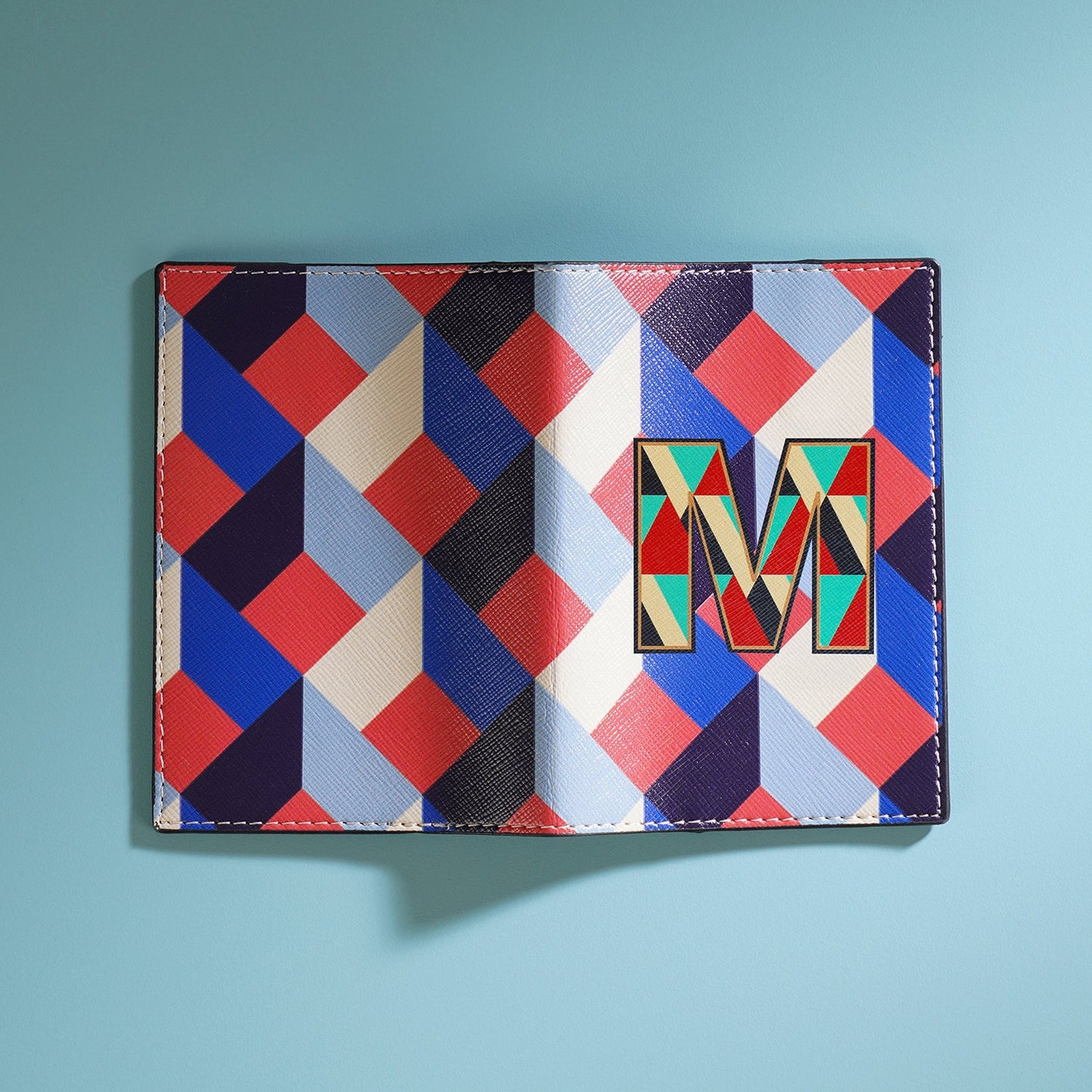 Meet your ultimate travel companion: a passport holder and luggage tag that blends bold style with personal flair. The striking blue and peach geometric backdrop, paired with a vibrant 'M', makes it not just a travel essential but a statement of identity and adventure.