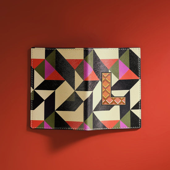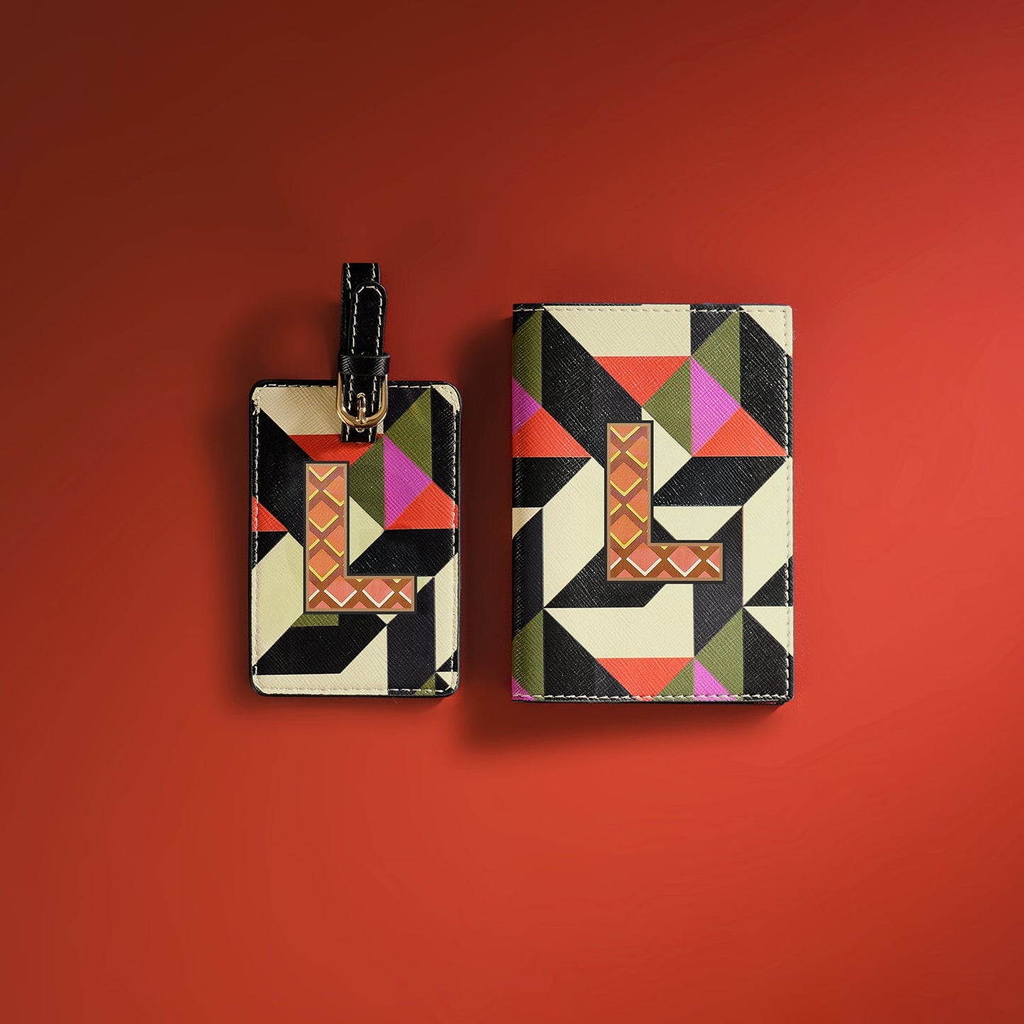 Meet your ultimate travel companion: a passport holder and luggage tag that blends bold style with personal flair. The striking orange and pink geometric backdrop, paired with a vibrant 'L', makes it not just a travel essential but a statement of identity and adventure.