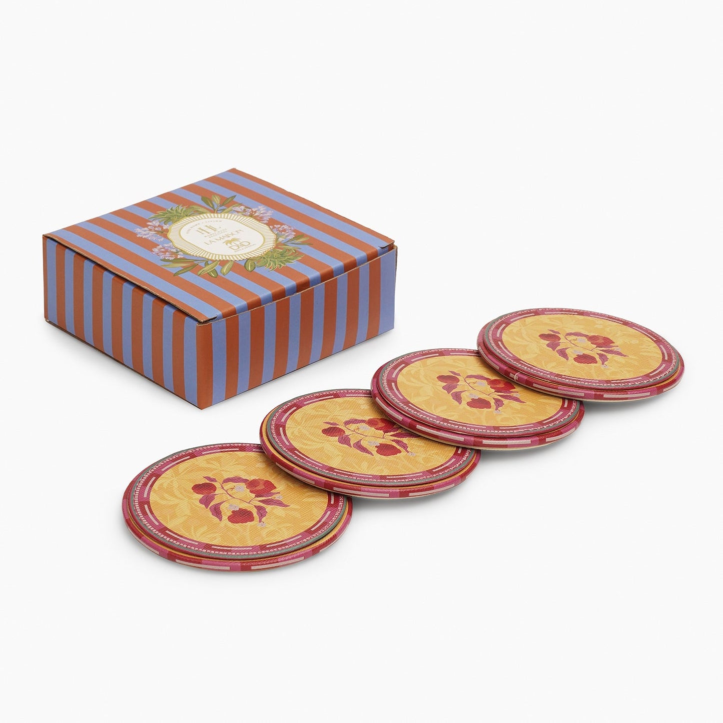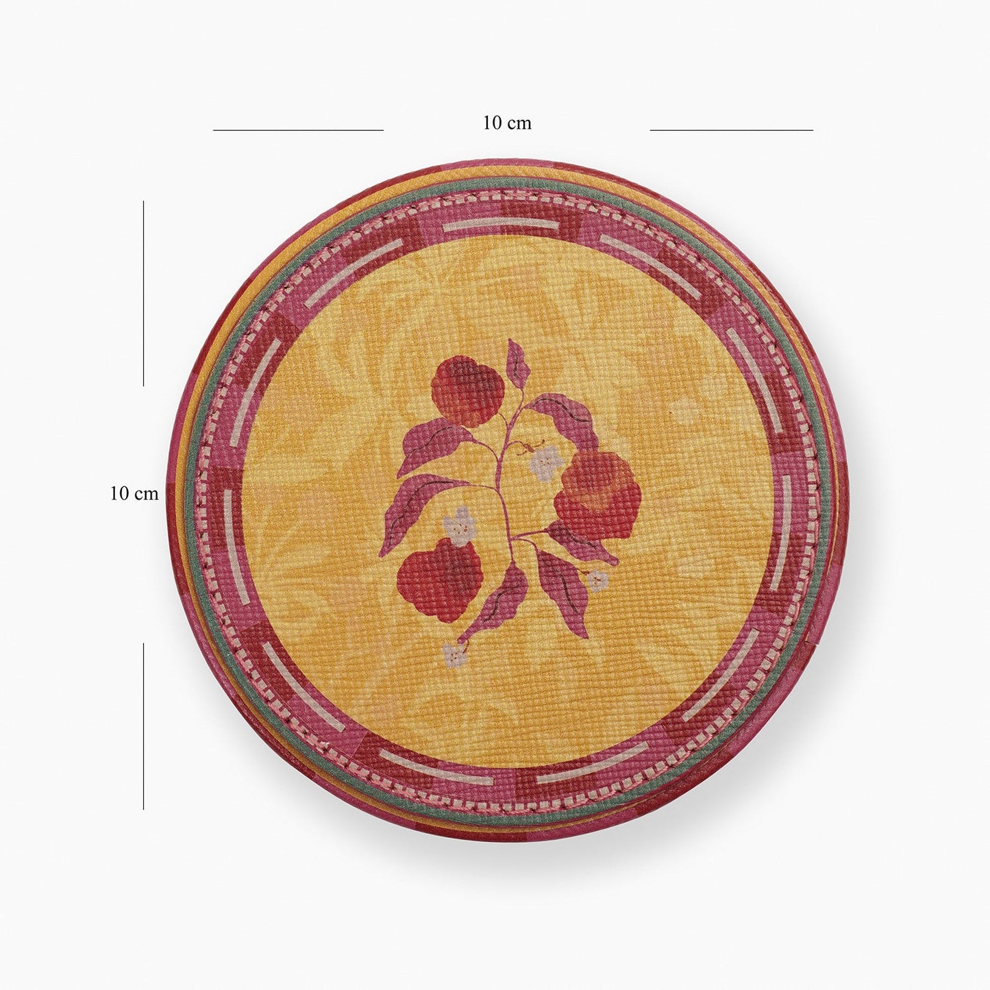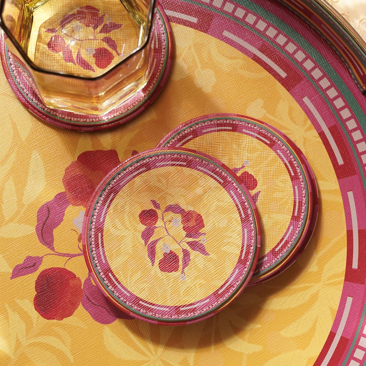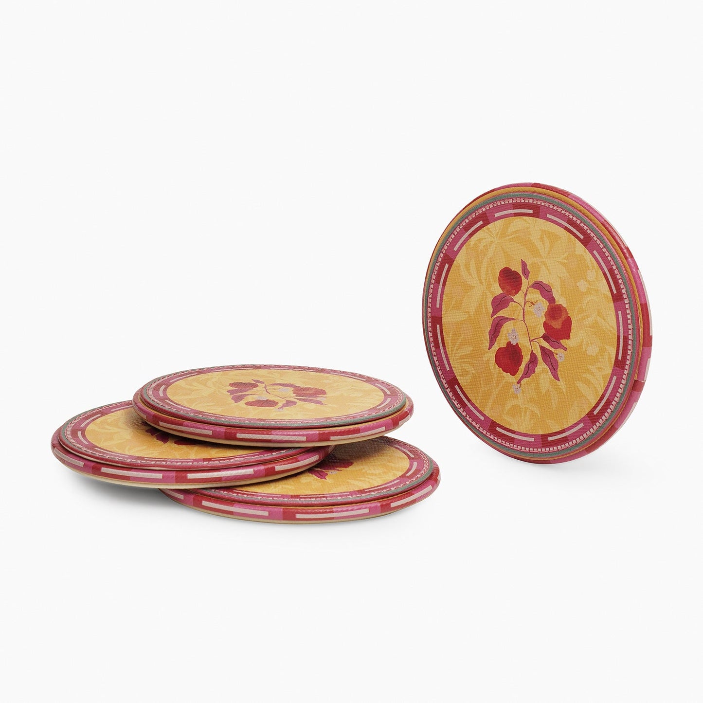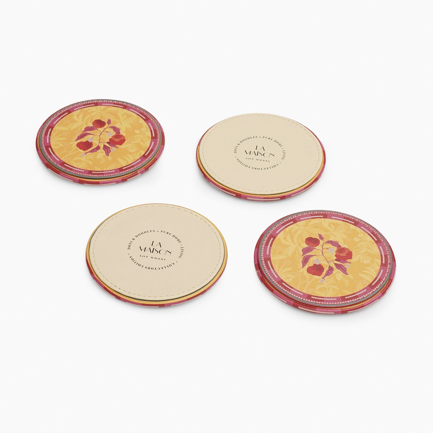 Set of 4 Yellow Printed Faux Leather Round Coasters