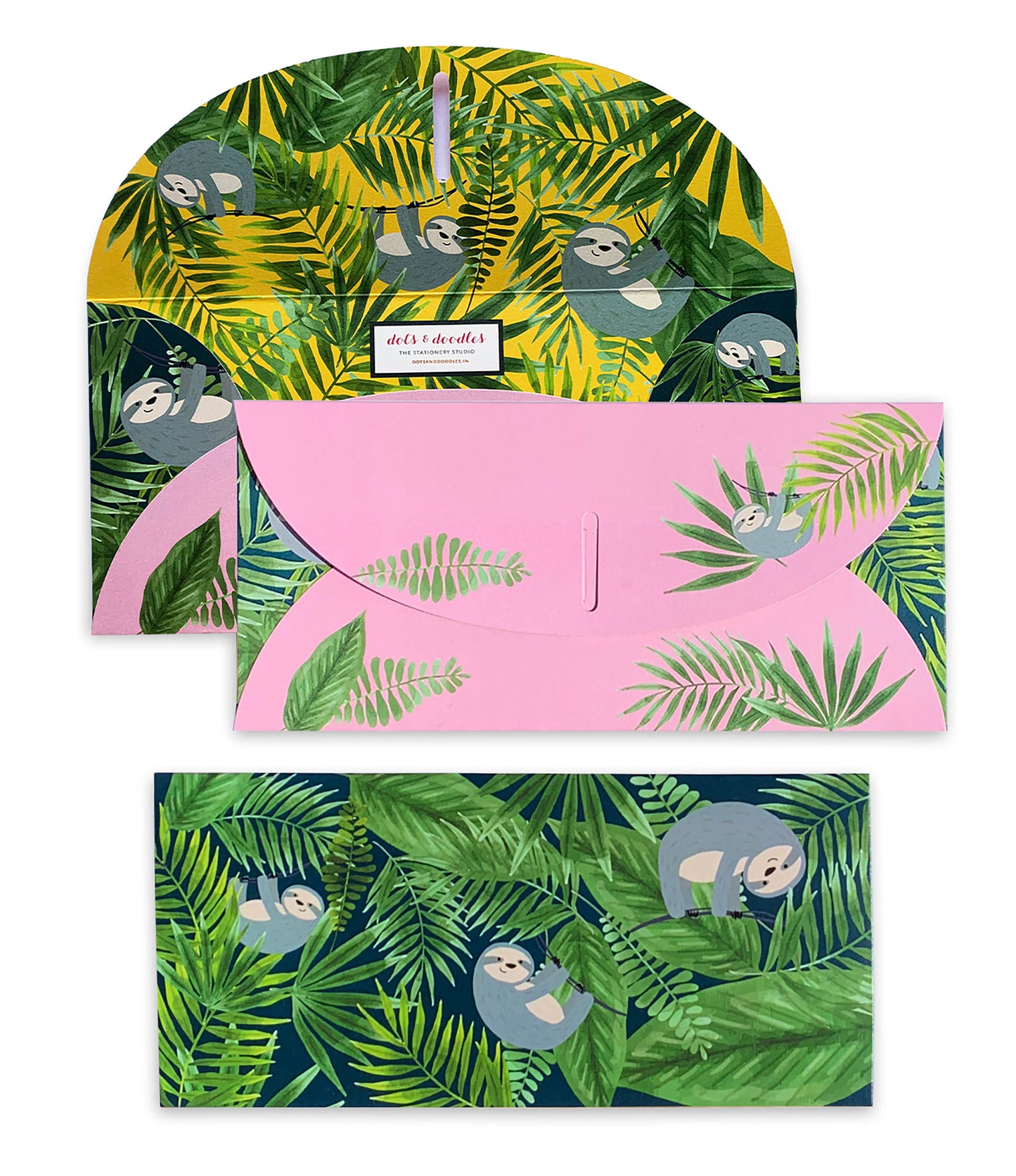 Regular price Rs. 1,349.00 INRSloth kids gift envelopes, illustrated with adorable sloth. Perfect for any occasion. Use it for a gift card or cash. Printed envelope, colorful lining inside. The envelope self locks, with a cute heart shape lock.