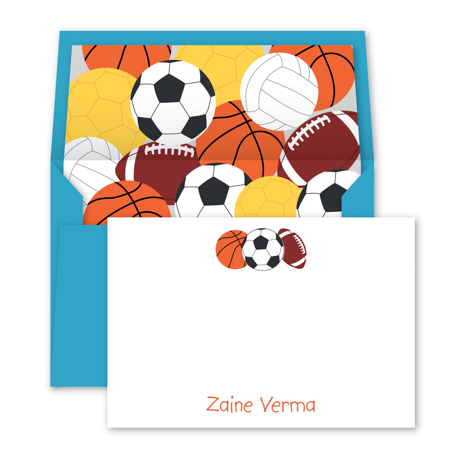 Sporty personalised set of boxed notecards paired with lined envelopes, illustrated with sports balls. These fun notecards can be used to send a greeting or as thank you, and even make a great gift.