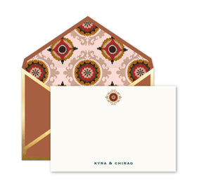 Suzani set of notecards, complemented with pattern. This Beautiful set of boxed notecards is the perfect accompaniment to your gift. This design is paired with a orange envelope. The envelopes are detailed with gold foil.