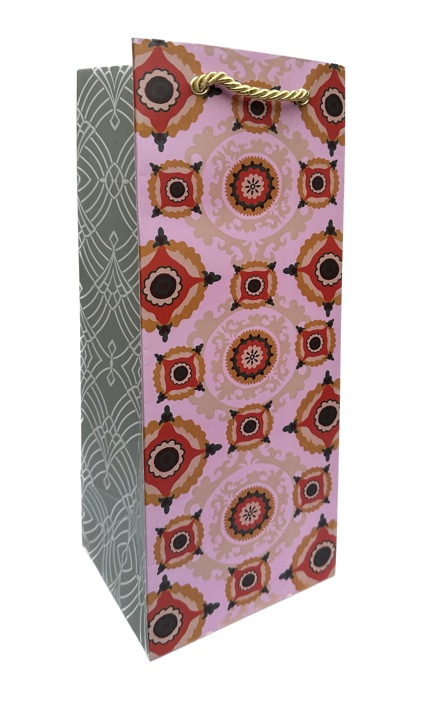 These bags are ideal for a variety of occasions such as birthdays and dinner party gifts. The matt laminated bottle bag is made from top quality 190gsm art paper with reinforced handles and base. Designed to carry up to a standard bottle. The bag comes with a gift tag for you to write your message.Size 13.5"x5"x 4.5"