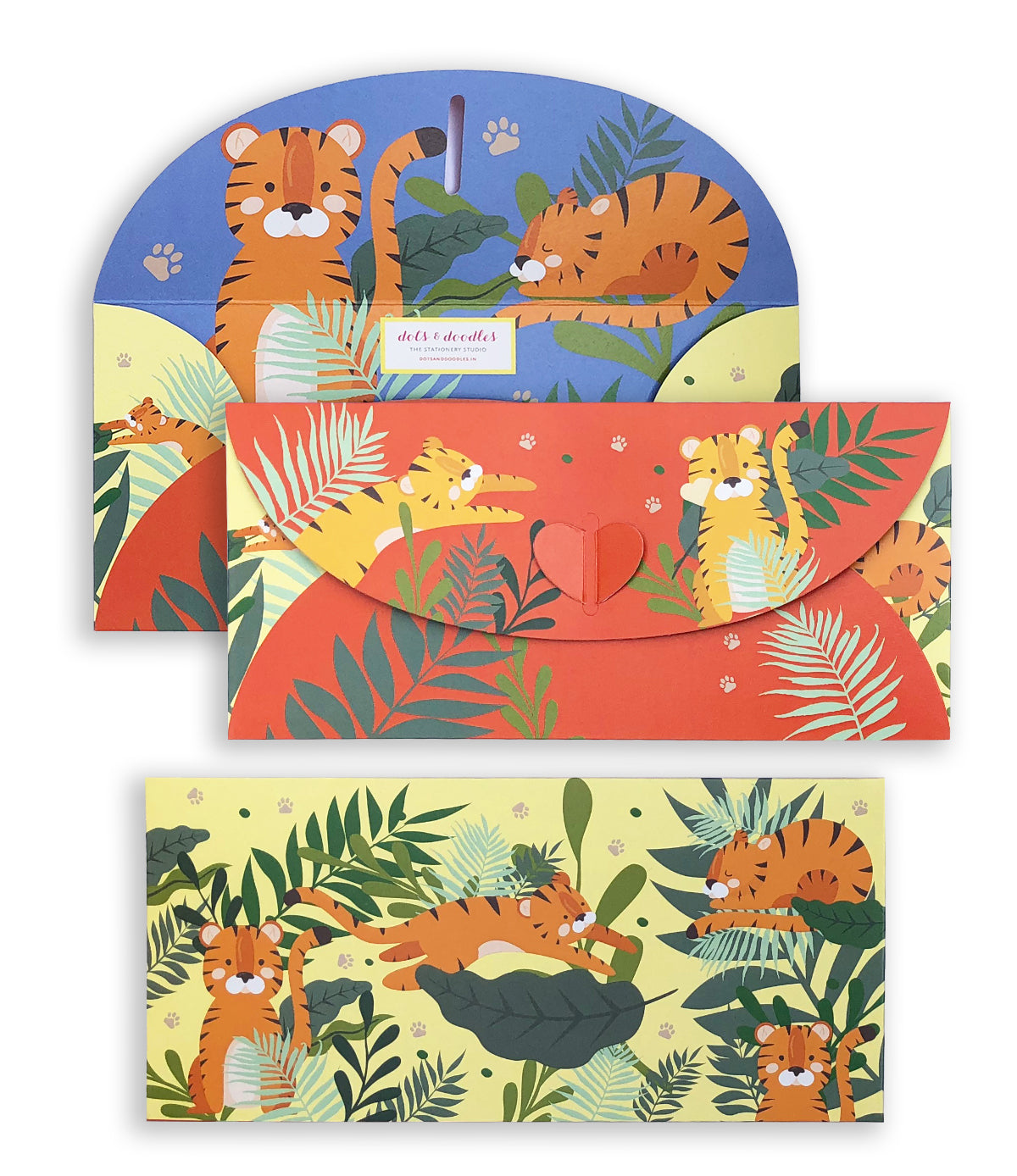 Cute Tiger kids gift envelopes, illustrated with adorable tigers. Perfect for any occasion. Use it for a gift card or cash. Printed envelope, colorful lining inside. The envelope self locks, with a cute heart shape lock.