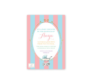 Vintage baby shower card. Honor the parents to be with this card Illustrated with baby stroller and stripes. Paired with a yellow envelope, magical raindrops lining.